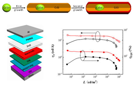 Recently, Professor Linsong Li's group reported the synthesis of high-quality alloyed CdSe1-xSxand CdSe/CdS core/shell QDs with controlled excited state properties by tuning the composition and shell. By applying this quantum dots into QLED with conventional device structure, so that the efficiency and brightness of the device have been greatly improved.