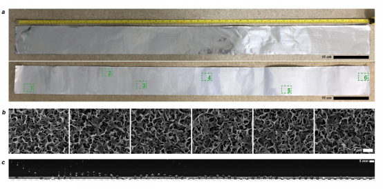 Figure 1. SEM images of one-meter-long WD-TENG and six different areas prepared, which are randomly selected from six different positions of WD-TENG (marked with green squares). Rebound experiment of water droplets (R0≈3mm) on WD-TENG.