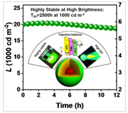 Since the first demonstration of QLEDs in 1994, device performance has been steadily improved to meet the requirements for low brightness displays (indoor displays). However, the short operation lifetime under high brightness still limits the application of QLEDs in outdoor displays and lighting.