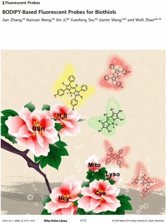 In recent years, Professor Weili Zhao’s research group has carried out a series of work on the construction and application of BODIPY fluorescent dyes, and achieved phased results, especially the successful construction of a series of BODIPY dyes to detect biological thiols. Recently, they were invited to publish a review paper in the Chemistry-A European Journal, summarizing and discussing current challenges and opportunities.