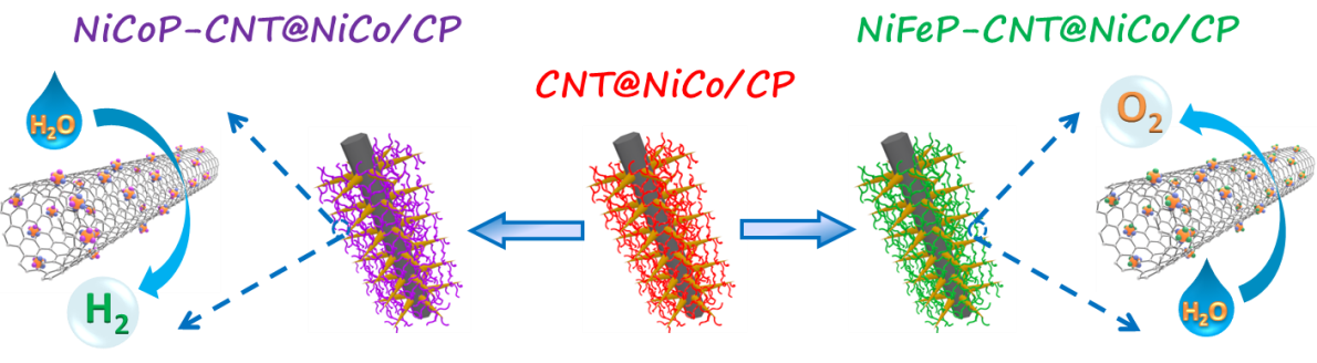 In this work, Yong Zhao’s group first prepared a self-supportive carbon nanotube network (CNT@NiCo/CP) with hierarchical branched architecture. Employing the above-mentioned self-supportive carbon nanotube as a support, and anchoring metal phosphide nanoparticles with abundant defect sites on the surface of carbon nanotubes (CNTs), and then, the self-supporting metal phosphide/carbon nanotube multi-stage composite electrodes (NiCoP-CNT@NiCo/CP and NiFeP-CNT@NiCo/CP) were successfully constructed. In the above composite electrodes, the CNTs and internal NiCo nanowire arrays guarantee the outstanding electronic conductivity and good mechanical stability of electrodes, and the metal phosphide nanoparticles anchored on the defect sites provide abundant active sites.