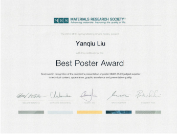 博士生刘艳秋同学的墙报“A Versatile Bottom-up Assembly Approach to Monodisperese Organic Nanocrystals from Porphyrin”喜获MRS大会最佳Poster奖.本次大会由全世界材料专业的近1500张Poster中选取了15张Poster作为大会的最佳Poster,是真正的“百里挑一”。本次获奖是69成人小说