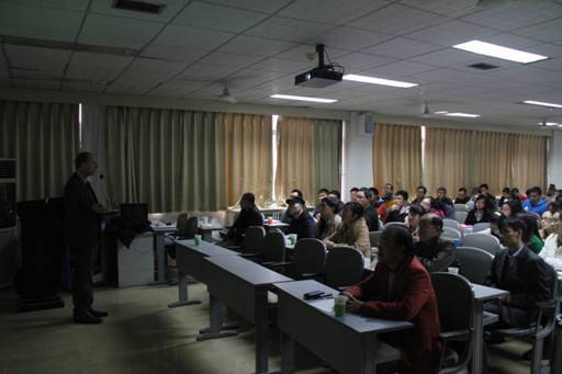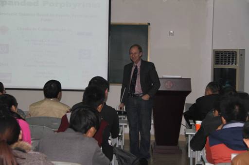 11月15日上午,应特种功能材料重点实验室邀请,国际著名的超分子化学学家,美国德克萨斯大学奥斯汀分校Sessler教授访问重点实验室,并在实验室二楼报告厅做了题为:“Expanded Porphyrins: Macrocylic Systems based on Pyrroles, Pyridine, and Furan”的学术报告。报告会由王华教授主持,特种功能材料重点实验室、天然药物与免疫工程重点实验室及化学化工学院的部分师生参加了报告会。
