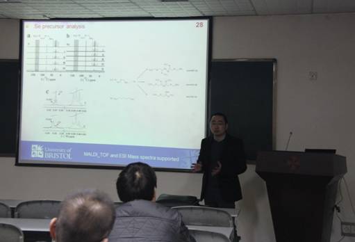 侯博士的研究方向涉及半导体电化学、量子点合成、光电化学、电分析等。在报告中,他首先介绍了CdSe1-xTex量子点的合成,及组成的变化对禁带宽度的影响;接着讲述了如何用无膦法绿色合成CdSe量子点,并对量子点的形成机理进行了系统研究;然后就目前太阳能电池领域关注的热点四元材料CuZnSnS和CuZnSnSe, 侯博士介绍了其中的电子转移过程;最后他介绍了如何用常规热注入的方法合成FeSe和FeSe2新型材料。侯博博士的报告内容丰富、讲述生动,尤其是他标准的全英文讲述给大家带来了全新的听觉享受,激发了同学们对英语学习的兴趣。报告会结束之后实验室的老师、同学就相关领域的科学问题与候博士进行了深入的交流和探讨。