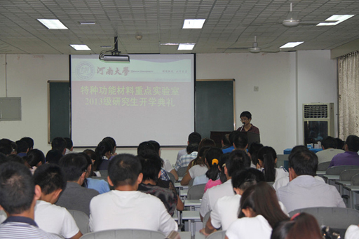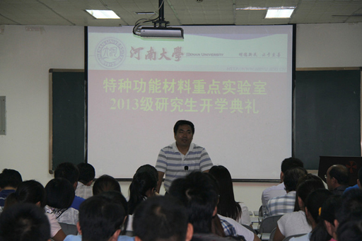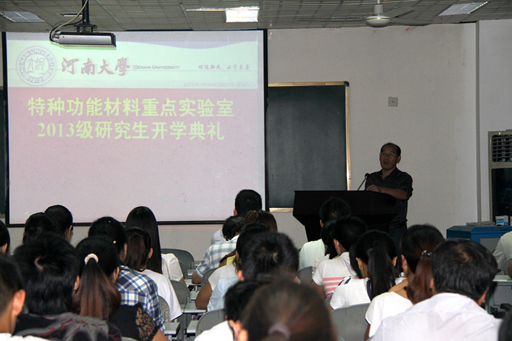 特种功能材料重点实验室2013级研究生开学典礼在实验室二楼报告厅隆重举行。实验室常务副主任杜祖亮教授,副主任白锋教授和胡彬彬副教授, 原总支书记崔元臣教授,省、校特聘教授,黄河学者,以及全体2013级研究生和老生代表出席了会议。典礼由实验室党总支副书记杨建军教授主持。