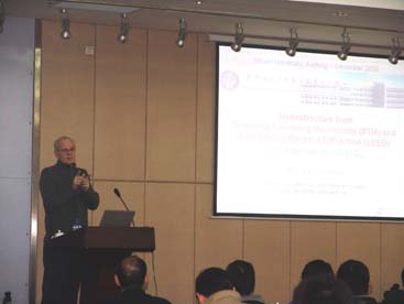 米謝尔•范何夫教授首先为大家介绍了香港城市大学及物理及材料科学系的历史、现状和发展前景,并就当今物理与材料领域内的研究现状做了高度概括。随后以“Nanostructure from STM and LEED”为题开始了他的讲演。在讲演过程中范教授不时为大家阐述纳米结构表面与界面的有关概念及结构重建对材料物理性能的影响,并着重介绍了STM和LEED在纳米结构材料研究中的重要作用和具体应用。范教授研究领域广泛而深入,成果卓著,他幽默风趣的演讲风格和地道的英语水准博得了大家的阵阵掌声。