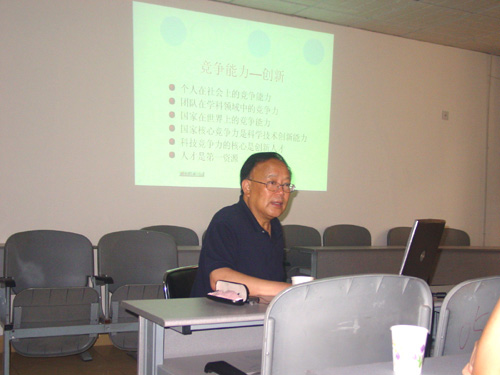 薛院士指出:科技竞争能力的核心是创新人才,人才是第一资源。要提高竞争能力,首先要有竞争意识,要面对竞争而不能逃避竞争。怎样提高竞争能力呢?知识是最好的武器,包括宽广、深厚、开放的基础知识,前言、灵活、扎实的专业知识,熟练、独立、更新的基本技能。有了这些知识,才能提高综合理解能力和综合实践能力。作为科研工作者,还要了解当前科学与技术的前沿,尤其是自己从事或相关领域的前沿动态,熟悉科学与技术大的发展趋势,十分清楚国际同行中几个重要课题组或实验室的工作情况,知道社会,经济的需求和发展趋势,从而找到方向,确定位置,实事求是的做事情。薛院士还结合自己的工作经历谈了一些科研中的体会。他说,做科研要敢于挑战“传统”与“权威”,但不能狂妄自大;要辩证的认识“冷门”和“热门”;要有强烈的好奇心,关注实验和研究中的奇异点。除此之外,还要有承受困难的能力,抓住机遇的能力,要有团队精神并注意情感智力的培养。最后,薛院士还就实验室的发展和研究课题的凝练提出了建设性的意见和建议。