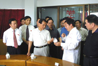 吴书记首先视察了大型仪器室、材料合成室。在展品室,实验室主任张治军教授系统地汇报了实验室在科学技术转化为生产力方面的特色工作,吴书记特别感兴趣.当介绍到纳米聚硅产品在油田及其它方面的应用时,吴书记不时地提出产品如何分散,用何种介质分散以及聚硅产品的修饰剂等非常专业的问题.最后吴书记对实验室的工作给予了高度评价并提出了殷切希望。