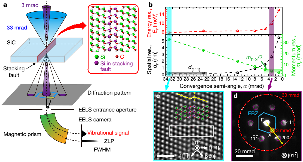 今日,国际顶级期刊Nature杂志(影响因子42.7)在线发表了题为Single-defect phonons imaged by electron microscopy的研究论文。该研究首次从实验和理论上实现了对单个面缺陷声子谱的探测和分析,通过改变动量空间的位置获得了在布里渊区边界的缺陷声子态密度。