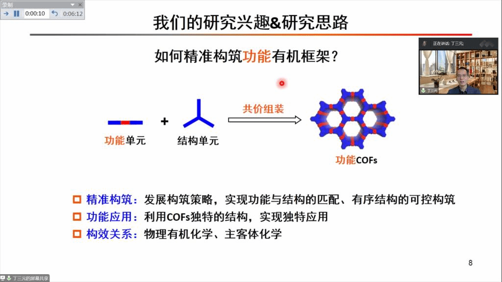 在本次报告中,丁三元教授结合自身的研究进展,重点介绍了自下而上策略构筑功能有机框架。从多组分反应构筑有机框架、基于多组分反应原位成环构筑稳定框架以及通过多组分反应实现功能有机框架的定向合成三方面进行了汇报。丁教授讲述了共价有机框架(COFs)的特点以及在各方面的应用,提出了如何按需合成的问题,并以异腈反应为例,将功能基团加入框架,阐述砌块在反应中的作用。报告完整讲述了多组分构筑功能COFs的新策略、新结构、新功能。