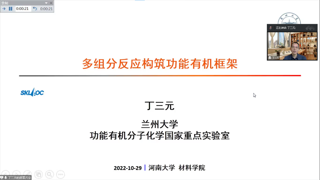 110周年学术系列活动”,以《多组分反应构筑功能有机框架》为题进行了精彩的学术报告。材料学院白锋教授主持了报告,报告采取线上模式(腾讯会议)进行,全校相关领域约60名教师与研究生参加了此次报告。