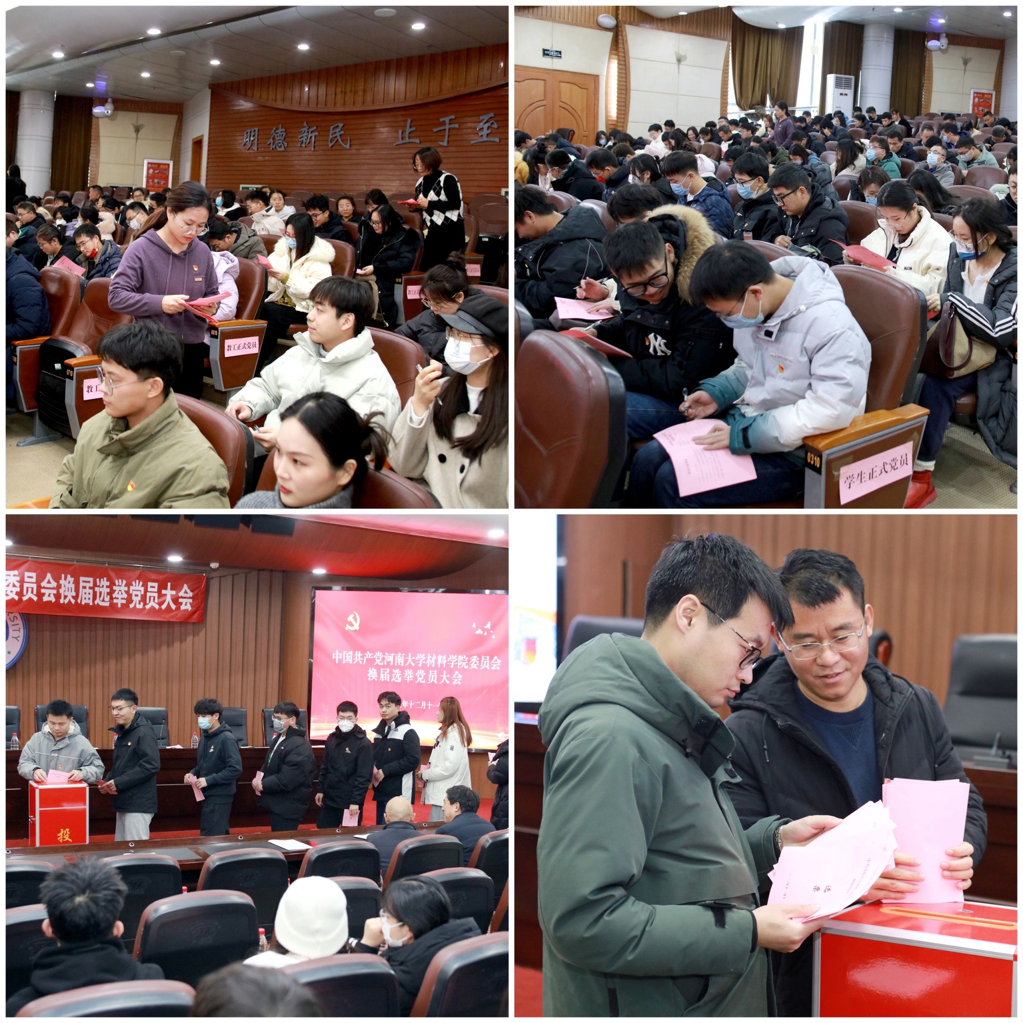 材料学院委员会换届选举办法(草案)》,大会审议并通过选举办法。副院长刘谨对八名候选人的基本情况逐一进行介绍。现场通过监票人、计票人提名人选,依照程序进行无记名投票。