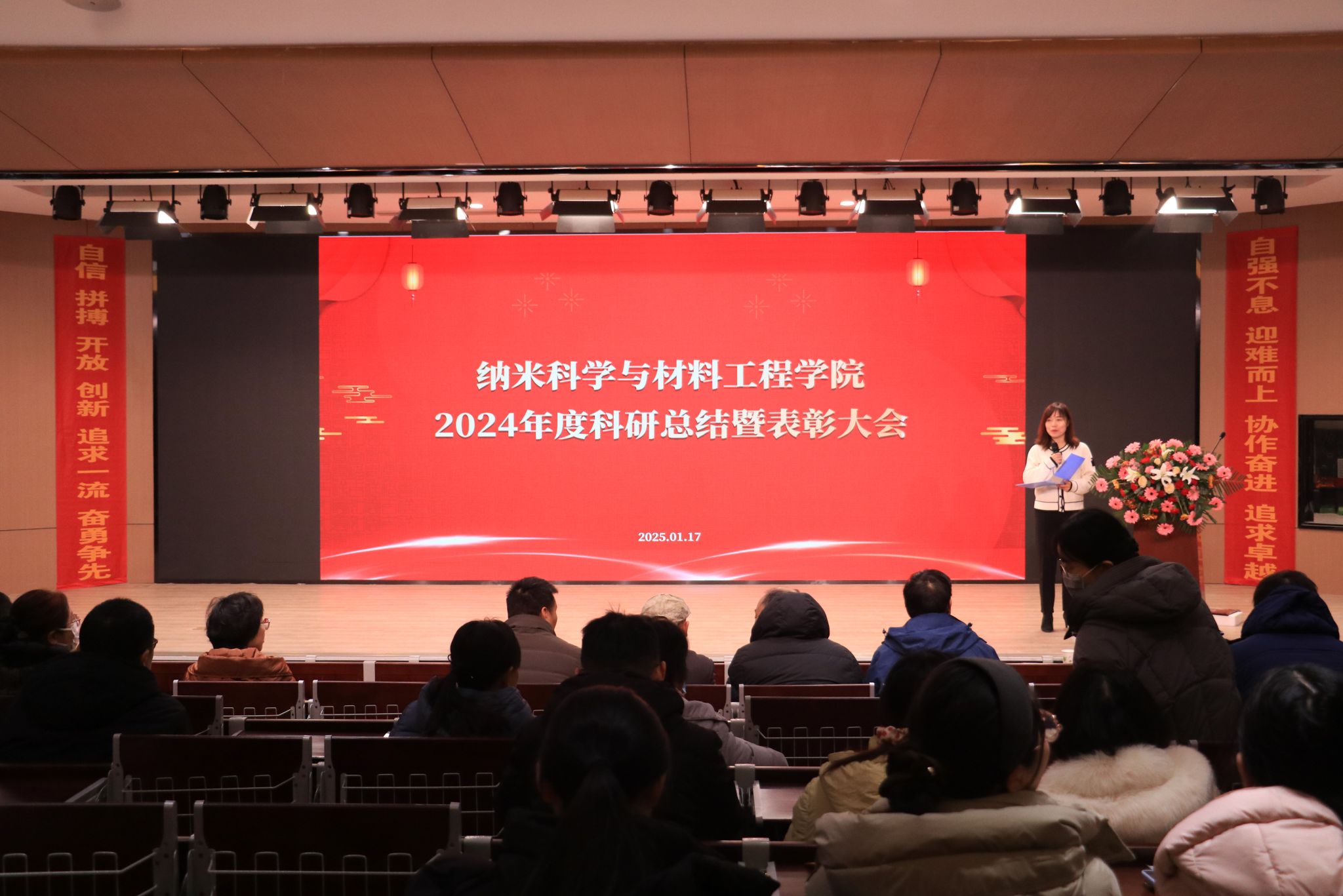 举行2024年度科研总结暨表彰大会,学院全体教职工及学生齐聚一堂,共同总结2024年度工作成果,表彰先进、凝聚共识,携手擘画2025新篇章。大会由副院长刘谨主持。