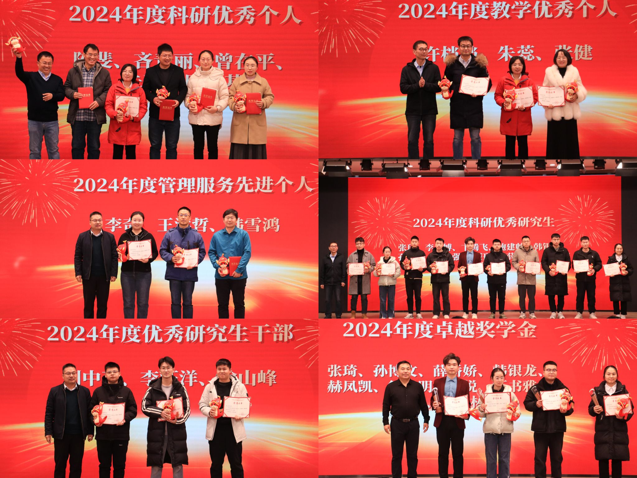 关于表彰科研优秀研究生、优秀研究生干部的决定》。随后,白锋、程轲、王书杰分别为获奖师生颁发荣誉证书。特种功能材料教育部重点实验室主任杜祖亮教授为获得2024年度卓越奖学金的学生颁发证书。他向获奖同学表示祝贺,并对全院同学提出了殷切希望,勉励同学们以获奖者为榜样,继续发扬勤奋学习、锐意进取的精神,保持昂扬斗志、勇于担当,砥砺前行,再创佳绩。