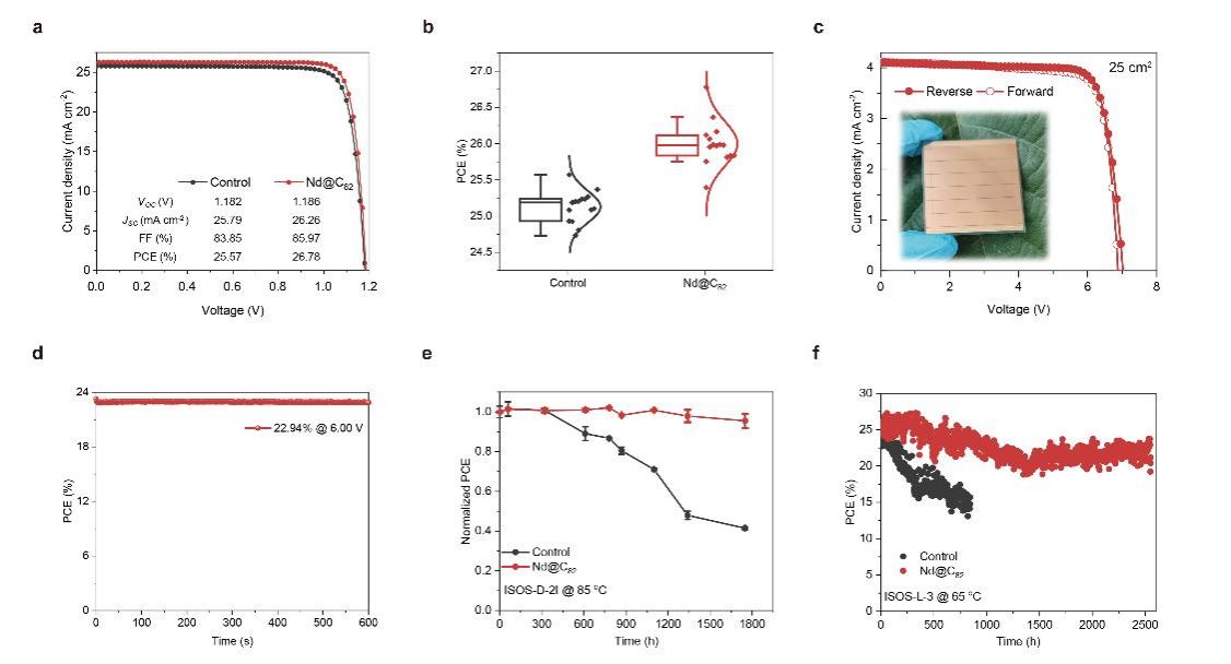 钙钛矿太阳能电池因其卓越的光电转化效率和低成本加工工艺,被视为下一代光伏技术的战略制高点。然而,如何在高效率的基础上兼顾器件的长期稳定性,始终是制约其商业化应用的关键挑战。针对这一问题,研究团队创新性地构建了由内嵌金属富勒烯分子Nd@C₈₂与聚甲基丙烯酸甲酯(PMMA)协同形成的复合界面结构,用于对钙钛矿活性层进行原位封装。Nd@C₈₂分子作为具有电磁耦合特性的电子提取介质,通过界面极化效应增强电子选择性传输能力,同时耦合PMMA赋予界面出色的物理封装与结构保护功能,显著抑制了离子迁移和环境侵蚀,提升器件在高温、高湿等复杂环境下的运行寿命。基于该策略构建的倒置型钙钛矿光伏器件,在小面积(0.08 cm²)测试中实现了高达26.78%的光电转换效率(认证值为26.29%),在大面积模块(16 cm²)的效率也达到了23.08%。更为重要的是,该器件在湿热测试标准(ISOS-D-3)下运行1000小时后效率保持在99%以上,在同类研究中处于国际领先水平。