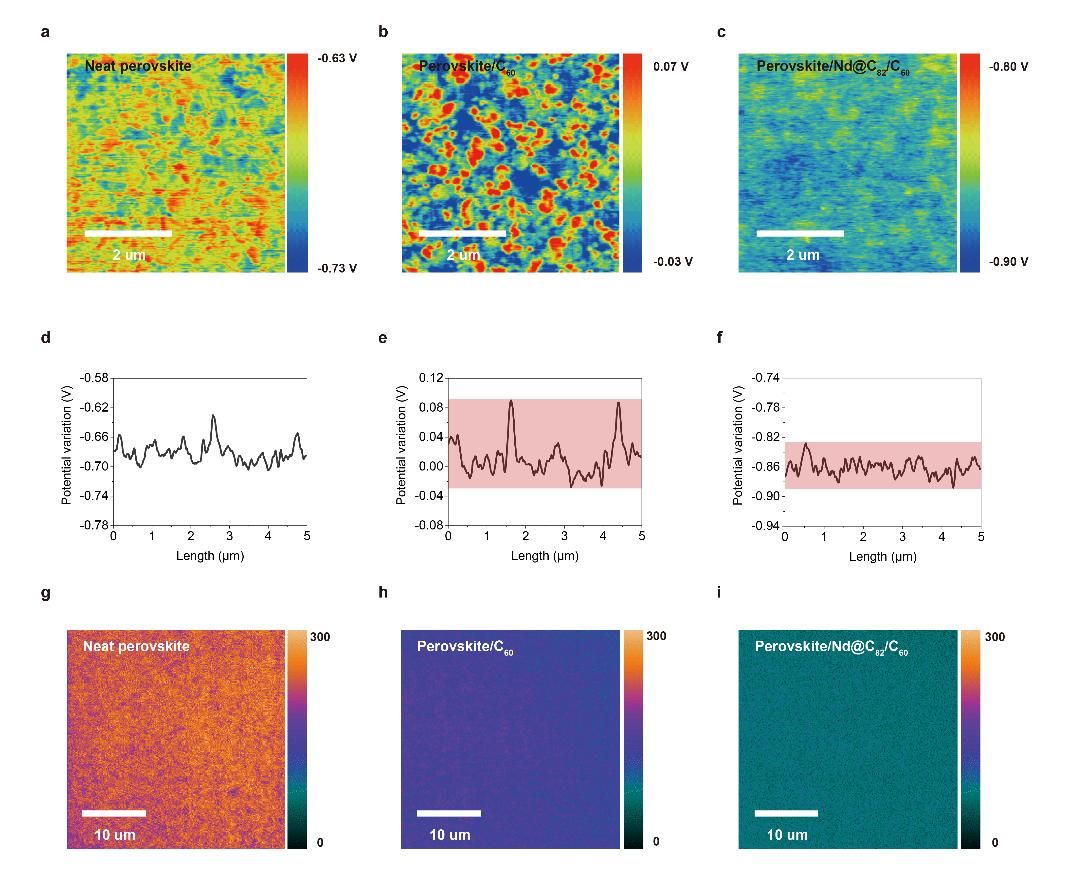 图2 具有Nd@C82-PMMA耦合层钙钛矿薄膜的电学和光学性质。(a-c)钙钛矿薄膜、钙钛矿/C60薄膜和钙钛矿/Nd@C82/C60薄膜的表面电势图;(d-f)钙钛矿薄膜、钙钛矿/C60薄膜和钙钛矿/Nd@C82/C60薄膜的表面电势变化;(g-i)钙钛矿薄膜、钙钛矿/C60薄膜和钙钛矿/Nd@C82/C60薄膜的光致发光扫描成像图。