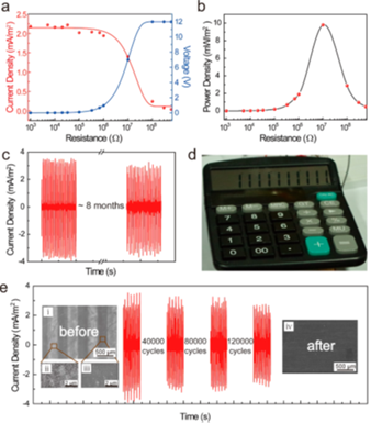 (a)S-TENG-CGG的电流密度、电压和负载电阻的关系;(b)S-TENG-CGG的功率密度和负载电阻的关系;(c)S-TENG-CGG的开始输出电流密度和8个月后的电流密度;(d)S-TENG-CGG给计算器供能;(e)S-TENG-CGG的服役性能测试,插图(Ⅰ)和(Ⅳ)分别是经120000周期前、后的电镜图,(Ⅱ)和(Ⅲ)分别是经RIE处理部分和未经RIE处理部分的电镜图。