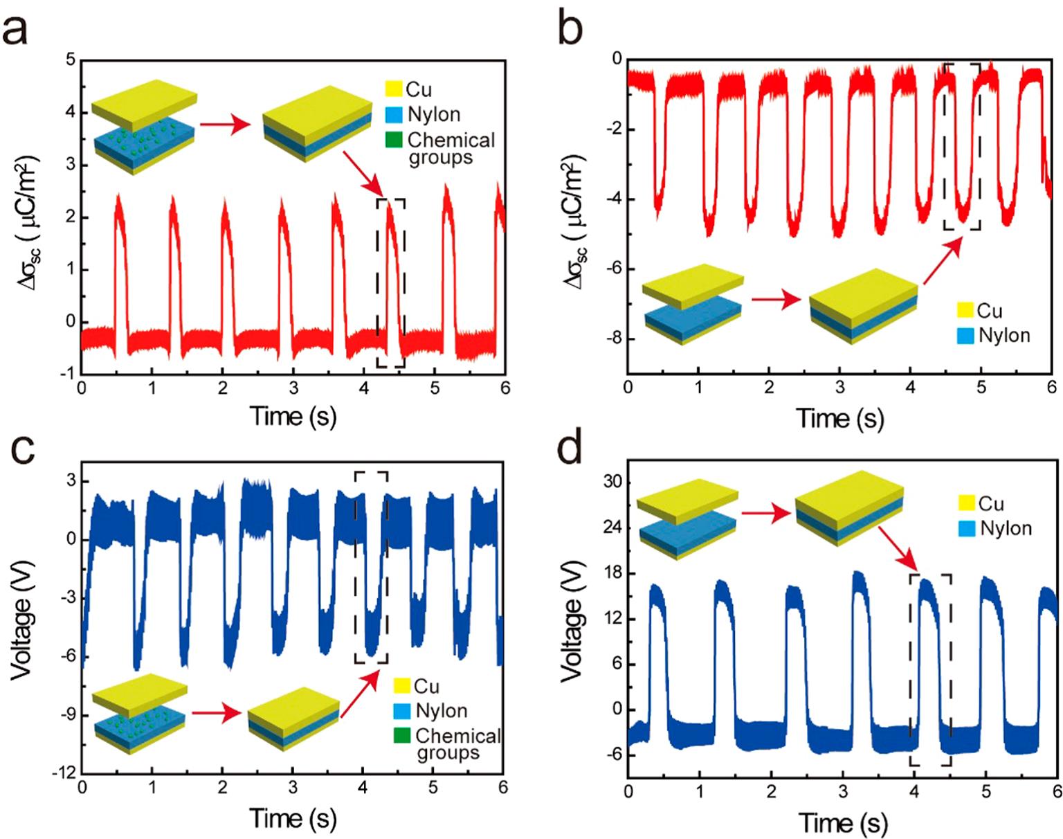 为了证明尼龙表面经离子束刻蚀前后的正负电性,研究人员又制作了一组接触分离式摩擦发电机,对经过离子束刻蚀和未经任何处理的器件表面进行了一组测试。在接触分离的过程中发现,经过刻蚀的和未经过刻蚀的尼龙表面的转移电荷和开路电压的正负电性恰好相反。测试结果如图2所示。