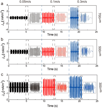 (a)700mm的栅格间隙下,具有不同速度S-TENG-CGG的电流密度;(b)500mm的栅格间隙下,具有不同速度S-TENG-CGG的电流密度;(c)300mm的栅格间隙下,具有不同速度S-TENG-CGG的电流密度。