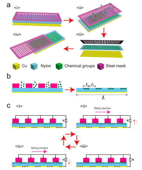 图1. (a)由化学基团构成栅格结构的滑移式摩擦纳米发电机的制备过程;(b)反应离子刻蚀过程的截面图;(c)由化学基团构成栅格结构的滑移式摩擦纳米发电机的工作机理。