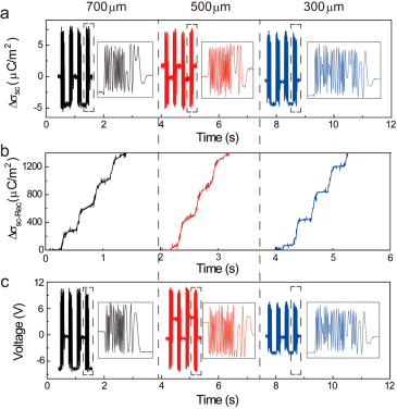 因该摩擦发电机是经化学反应离子束刻蚀而形成的正负交替电性的结构,那么,该器件经长时间放置后是否仍具有良好的电学性质便成为了研究中重要的问题。研究人员将该器件放置8个月后再次进行测试,测试结果表明,S-TENG-CGG经过长时间的搁置后运作,仍然具有良好的工作性能,其衰减非常小,图6(c)。