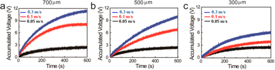 图5.(a)700mm的栅格间隙下,S-TENG-CGG给电容充电的电压曲线;(b)500mm的栅格间隙下,S-TENG-CGG给电容充电的电压曲线;(c)300mm的栅格间隙下,S-TENG-CGG给电容充电的电压曲线。