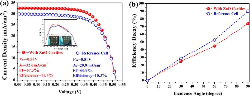 该工作利用胶体球模板技术并结合水热生长技术大面积构筑了高度有序的ZnO空腔结构,对有序ZnO空腔结构的生长机制进行了详细的研究;在此基础上,将此高度有序的ZnO空腔结构引入到铜铟镓硒(CIGS)薄膜光伏器件中,利用高度有序ZnO空腔结构独特的光学特性实现了CIGS薄膜光伏器件的光吸收增强,在ZnO空腔结构的增效作用下,CIGS器件的光电转换效率达到11.4%,其短路电流密度(Jsc)增强了9%,光电转换效率增强了10.6%。更重要的是,这种有序ZnO空腔结构除了可以有效增加器件的光吸收效率外,还显现出良好的广角吸收特性,该特性可有效保证在任意入射光角度下,器件都能保持良好的光吸收能力。该研究成果为发展全天候高效CIGS薄膜光伏器件提供了一种新的研究思路和方法。
