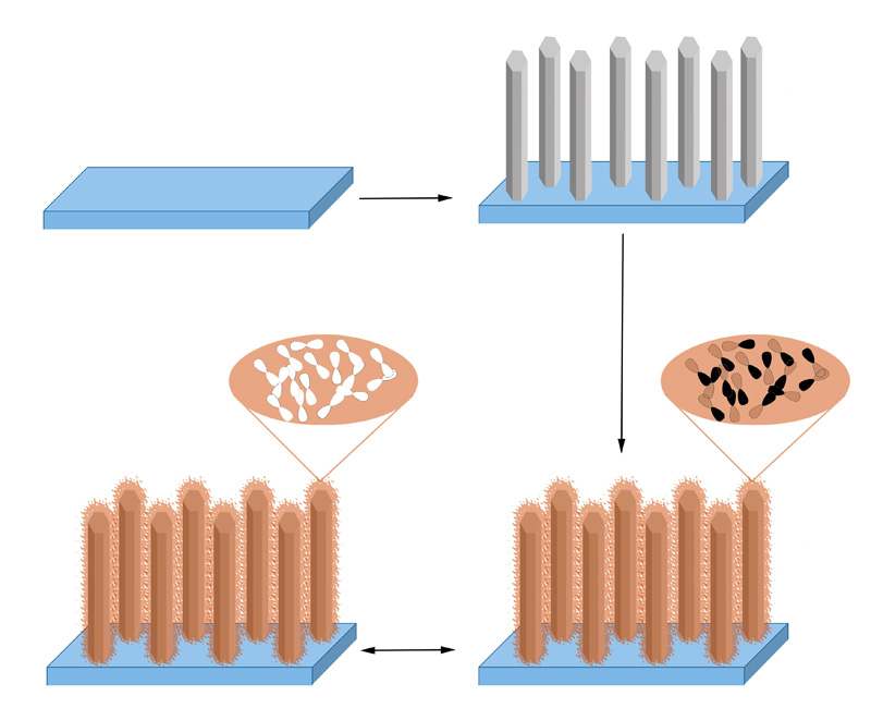 该论文报道了基于三维分子印迹聚合物阵列传感器的构建以及在肾上腺素电化学检测方面的应用。该研究工作首先利用电沉积法制备稀疏的氧化锌纳米棒阵列,然后以此为模板和支架采用电沉积法制备对肾上腺素具有选择性识别能力的三维分子印迹聚合物阵列,结合差示脉冲法可实现肾上腺素的高灵敏度检测。相对于传统的平面分子印迹聚合物薄膜作为传感器识别单元,该研究所提出的三维分子印迹聚合物阵列作为识别单元因比表面积高、待测物传质阻力低等优点,使得其检测范围和灵敏度得到显著提高。该研究成果在仿生传感器构建及特定化合物检测方面具有重要的指导意义。