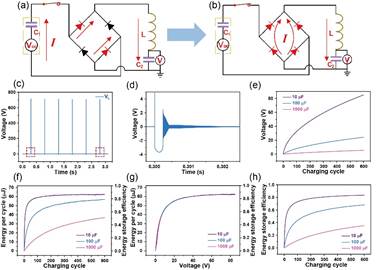 图2无源电源管理电路的能量转移过程及模拟的能量存储效率。(a-b)基于Pulsed-TENG的无源电源管理电路的两个能量转移阶段;(c)无源电源管理电路中通过电感的电压;(d)无源电源管理电路中通过电感的电压在第一个充电循环的放大图;(e)无源电源管理电路中储能电容C2的电压随充电循环变化的曲线;(f)无源电源管理电路单个充电循环的存储能量和能量存储效率随充电循环变化的曲线;(g)无源电源管理电路单个充电循环的能量和能量存储效率随储能电容C2的电压变化的曲线;(h)无源电源管理电路总能量存储效率随充电循环变化的曲线