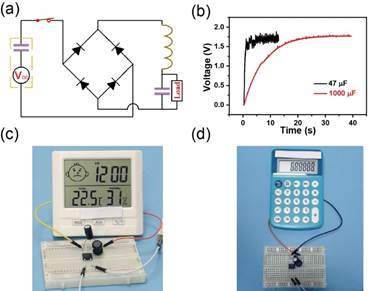 图4基于Pulsed-TENG无源电源管理电路驱动电子设备的演示。(a)基于Pulsed-TENG的无源电源管理电路驱动电子设备的电路图;(b)无源电源管理电路选用不同电容器时驱动温度湿度计时的电压曲线;(c)无源电源管理电路驱动温度湿度计正常工作的实物图;(d)无源电源管理电路驱动计算器的实物图。