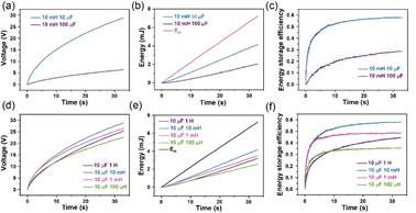图3 TENG-EVS在不同电容、不同电感下的充电曲线、输出能量和能量存储效率的实际测试结果。(a)不同电容器下的无源电源管理电路储能电容C2的电压随时间变化的曲线;(b)不同电容器下的无源电源管理电路存储的能量随时间变化的曲线;(c)不同电容器下的无源电源管理电路的能量存储效率随时间变化的曲线;(d)不同电感下的无源电源管理电路储能电容C2的电压随时间变化的曲线;(e)不同电感下的无源电源管理电路存储的能量随时间变化的曲线;(f)不同电感下的无源电源管理电路的能量存储效率随时间变化的曲线。