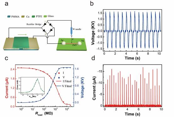 图一(a)基于摩擦纳米发电机的表面钝化系统示意图及电压-时间曲线(b),输出电压(电流)随负载变化的曲线(c),微等离子体表面钝化过程中的放电电流曲线。