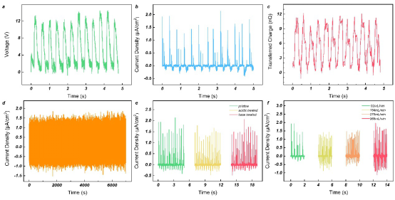 图2. WD-TENG的输出性能:输出电压(a)和电流密度(b)和转移电荷(c);(d) WD-TENG的稳定性测试;(e)耐酸耐碱稳定性测试;(f)基于WD-TENG的自驱动流速计。