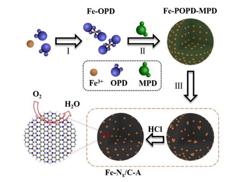 过渡金属/氮共掺杂碳(M-Nx/C)材料由于具有好的催化活性和高选择性,被广泛应用于各种化学/电化学反应。M-Nx/C的催化活性受金属位点数量的影响,而制备具有高密度金属活性位点的M-Nx/C材料依然是该领域的一项挑战。一般情况下,由于M-Nx/C催化剂需具备良好的导电性和稳定性,并能形成M-Nx活性位点,因此需要将包含金属的前驱体在高温下热解转化为M-Nx/C材料。然而,前驱体中的碳骨架在高温下容易分解,导致M-Nx/C材料中金属原子团聚、金属活性位点数量大幅减少的问题。因此,提高热解过程中碳保留率、抑制金属原子聚集,对于提升碳材料的金属位点密度是非常重要的。