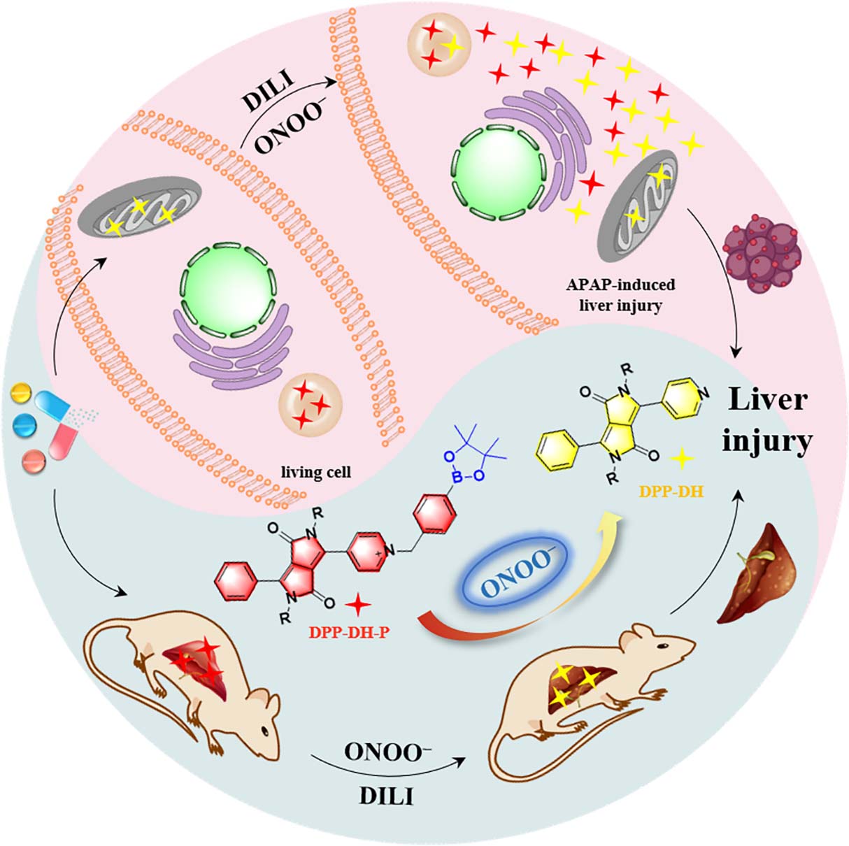 药物性肝损伤(DILI)的早期诊断和检测对于肝损伤患者的有效防治具有重要意义。研究表明,肝脏中过氧亚硝酸盐(ONOO‒)水平的上调与对乙酰氨基酚(APAP)诱导产生的肝损伤密切相关。我们构建了基于吡咯并吡咯二酮(DPP)的比例式荧光探针(DPP-DH-P和DPP-DEG-P),用于检测和成像ONOO‒。其中,二乙二醇单甲醚链修饰的探针DPP-DEG-P展示出更高的信噪比(2750倍)和更低的检测限(3.5 nM),用于追踪溶液中的ONOO‒。生物相容性更好的烷基链修饰的探针DPP-DH-P通过比率成像以高信噪比(20倍)成功监测LPS/IFN-γ或APAP诱导的肝细胞中ONOO‒的浓度波动。此外,该探针还可用于评估谷胱甘肽对DILI的修复作用。我们意外地发现探针DPP-DH-P及其与ONOO‒反应后的产物DPP-DH分别靶向溶酶体和线粒体。基于APAP诱导ONOO‒的浓度变化,我们观察到DPP-DH-P和生成的DPP-DH从溶酶体扩散到细胞质中,而DPP-DH由于内源性过量ONOO‒的影响而不再靶向线粒体,这些结果间接反映出细胞器功能障碍。这项工作将加速对DILI发病机制的更深入理解,为DILI的诊断和治疗提供有效的工具。