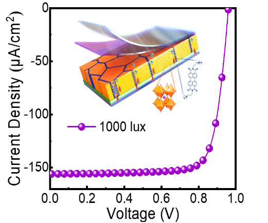 图 1. PDINO改性的钙钛矿光伏器件的弱光(1000 lux)下J-V曲线和器件结构示意图。