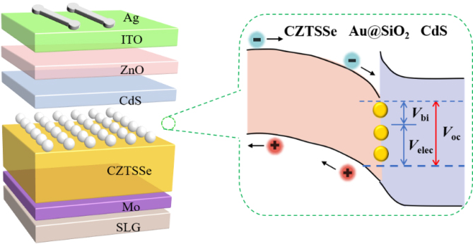 Cu2ZnSn(S,Se)4 (CZTSSe)作为一种环境友好型的直接带隙材料,广泛应用于薄膜太阳能电池,但其界面自发形成的无序缺陷会产生较多的复合中心,并造成界面费米能级钉扎和界面能带弯曲较小等问题,CdS/CZTSSe异质结的p-n过渡区不能实现有效的p-to-n反转。电子提取的能力降低会导致较大的开路电压损失 (Voc,deficit),从而影响光伏性能。武四新教授课题组通过二维有序的Au@SiO2 NPs阵列静电组装到氨基硅烷改性的CZTSSe吸收层上,将局域电场增强的等离激元效应引入CdS/CZTSSe界面,进一步改变Au@SiO2 NPs的间距来调节CdS/CZTSSe界面电学性能。结果表明,局域电场的存在增大了界面电荷积累,使静电势(Velec)有所增加,有利于Voc的提升。同时,金纳米阵列和吸收层表面的相互作用也会影响激子结合能,改善界面电荷分离并抑制载流子的复合,提高Jsc。最终,界面电学性能的增强使器件PCE从10.19%提升至11.50%。基于局域电场增强的界面结构为CZTSSe太阳能电池构筑高质量p-n结提供了一个新方向,对锌黄锡矿太阳能电池界面改善具有重要意义。