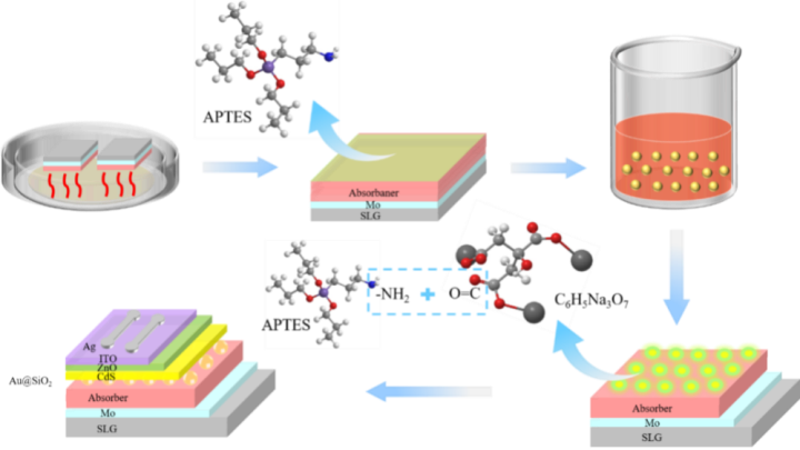图一. CdS/CZTSSe界面的二维Au@SiO2 NPs阵列静电组装过程