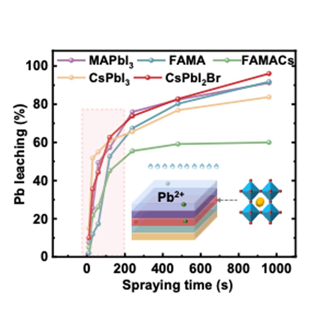 图 1. 模拟雨水喷淋环境下五种高效钙钛矿光伏器件铅沥出结果。