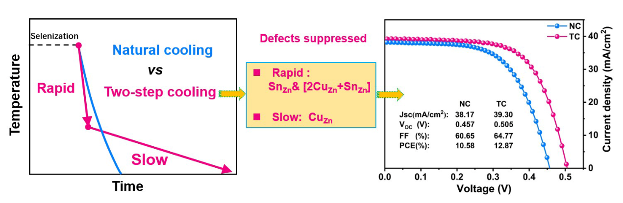 锌黄锡矿薄膜中存在着大量的本征缺陷和缺陷簇,特别是以CuZn和SnZn为代表的有害缺陷,是导致严重的非辐射复合以及较差光伏性能的重要原因。大多数缺陷在晶体生长过程中形成,近年来的研究表明调控晶体生长过程来抑制本征缺陷是一个有效策略,但是晶体生长过程中降温过程的影响被研究者们忽视了。基于之前的掺银CZTSSe工作,我们对硒化长晶的步骤设计了先快后慢的两步降温策略,实现了Sn相关缺陷和缺陷簇以及Cu-Zn无序缺陷的协同抑制。较高温度段的快速降温抑制了锌黄锡矿相分解和Sn的损失,抑制了Sn相关的缺陷和缺陷簇,低温段的慢速降温给了晶格充分的弛豫时间,提高了Cu-Zn有序度,两段降温过程协同作用,减弱了带尾态效应,促进了载流子传输,最终使开压提高近50 mV并实现了12.87%的光电转换效率。本研究工作首次指出了硒化降温过程对缺陷的影响,同时对抑制本征缺陷,提高锌黄锡矿太阳能电池效率提供了一个简便有效的新思路。