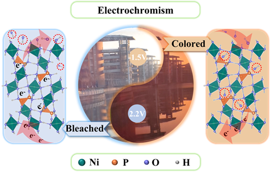 在如今“碳中和”的背景下,构建绿色节能建筑已成为环境保护和节能减排的重要途径。作为建筑与外界进行光热交换的主要通道,电致变色智能窗在绿色建筑中重要组成部件。高质量电致变色材料是构筑高性能电致变色智能窗的前提。镍基电致变色材料因其成本低和中性着色等特点得到了广泛的研究。然而,由于多数镍基材料的电子导电性低,反应位点不足,导致光学调制范围小是限制其实用化的重要瓶颈。