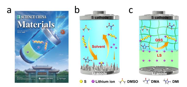图a)封面图;b)多硫化物及高极性溶剂与锂金属发生严重的副反应;c)液态/准固态两相电解质抑制高极性溶剂中多硫化物穿梭效应及锂枝晶生长。