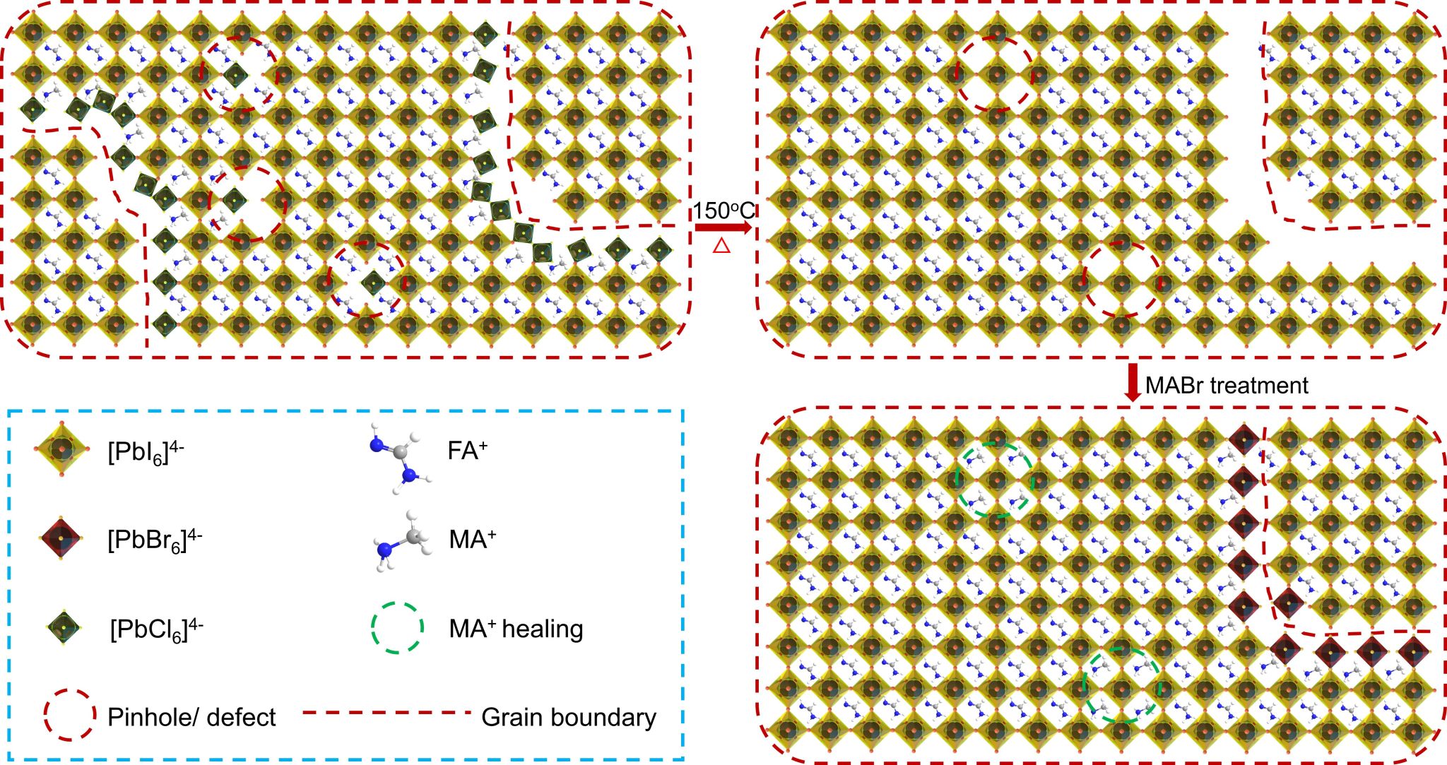 图 1. MACl 对钙钛矿晶体的作用机制和MABr后处理机理示意图。