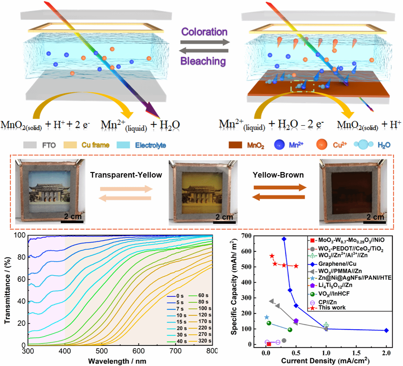 电致变色智能窗户可以为现代建筑提供阳光和太阳热量的动态控制。然而,如何即实现多波段调控又可多色彩显示仍然是一个巨大的挑战。本文报道了一种基于MnO2沉积/溶解的可逆电沉积变色策略,突破传统电致变色器件先筑膜后变色的模式,实现了紫外及可见双波段超大光调制、透明/黄色/棕色/深棕色的多色彩切换,以及超高的电荷存储能力。该金属氧化物可逆电沉积策略有望为电致变色技术和多功能电致变色器件的发展提供独特的思路。