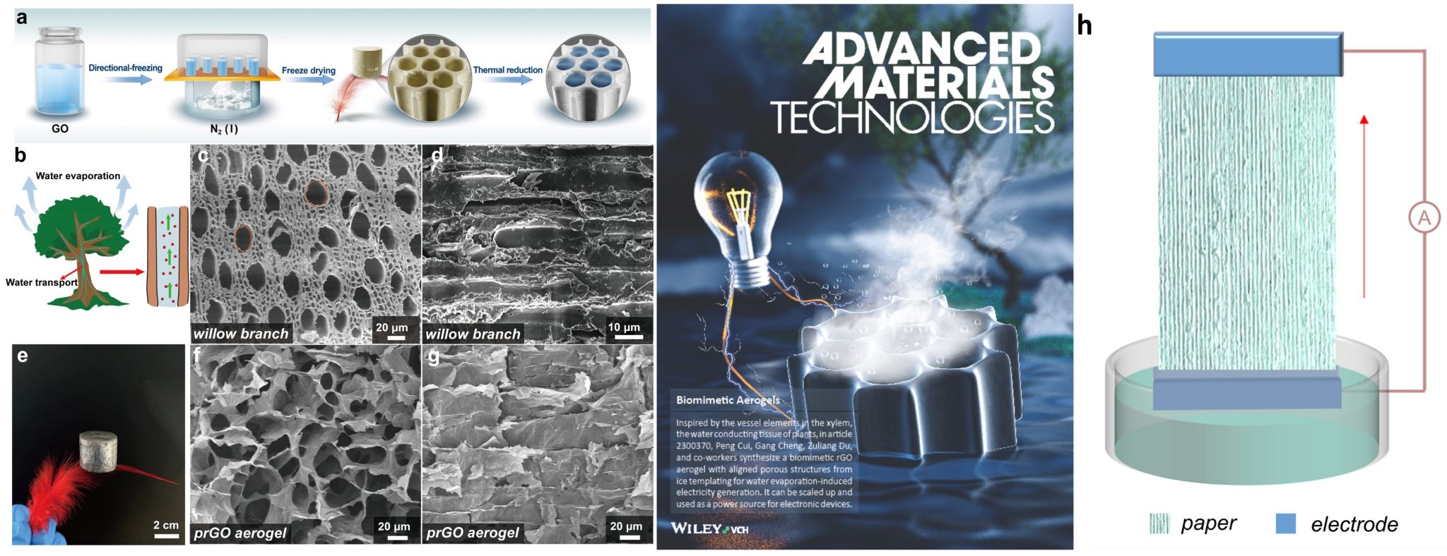 另一方面,受木本植物木质部中导管结构的启发,在定向冰模板的辅助下,我们制备了具有对齐多孔结构的仿生石墨烯气凝胶。由于具有优异的蒸发输水率,有效地提高了水伏发电的性能。该研究成果以Biomimetic Aerogel with Aligned Porous Structures from Ice Templating for Water Evaporation-Induced Electricity Generation为题在国际学术期刊Advanced Materials Technologies上发表。该研究成果被国际仿生工程学会推荐报道。69成人小说