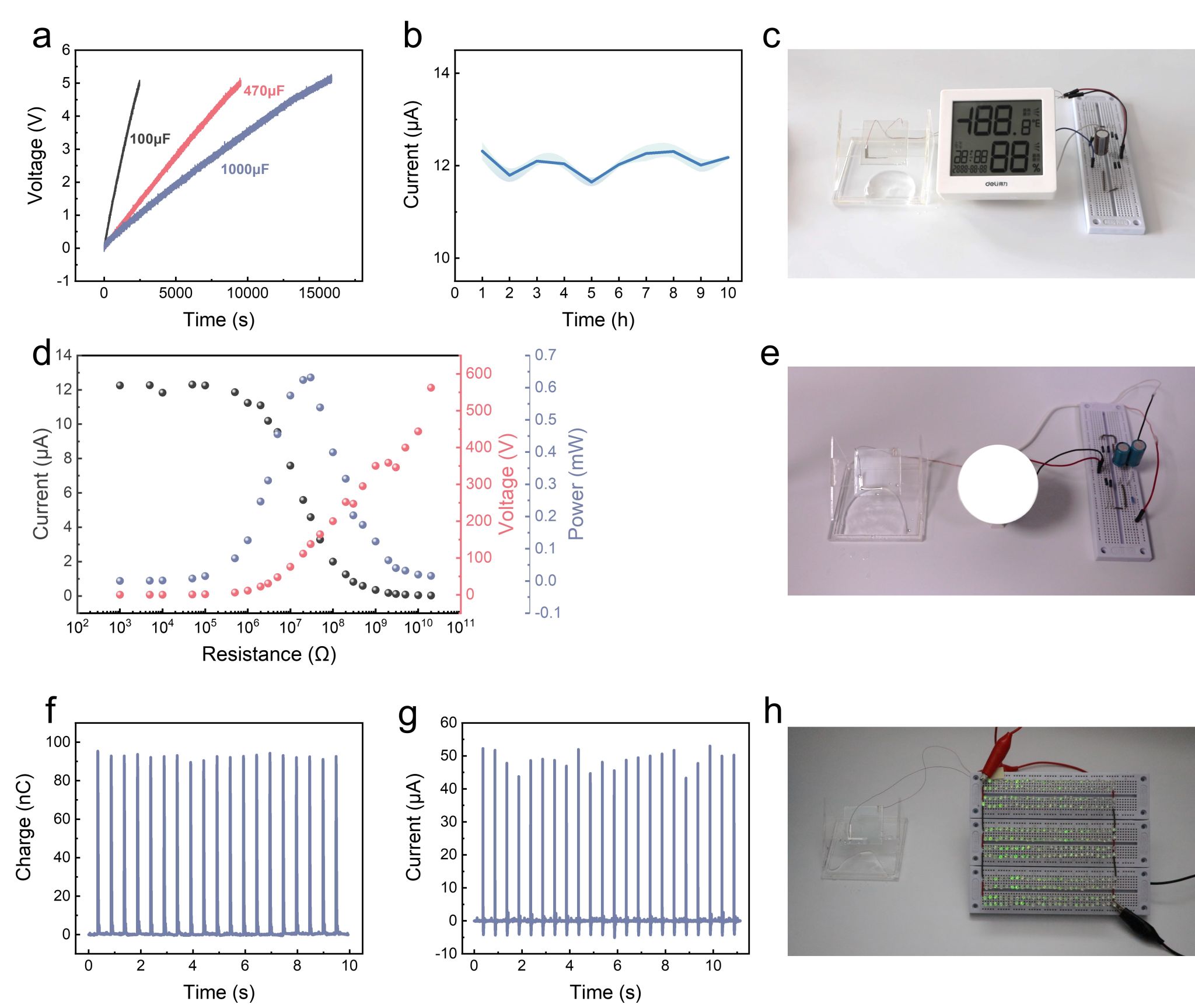 图3. 器件的结构、输出性能以及水滴在凝胶表面的运动状态分析。