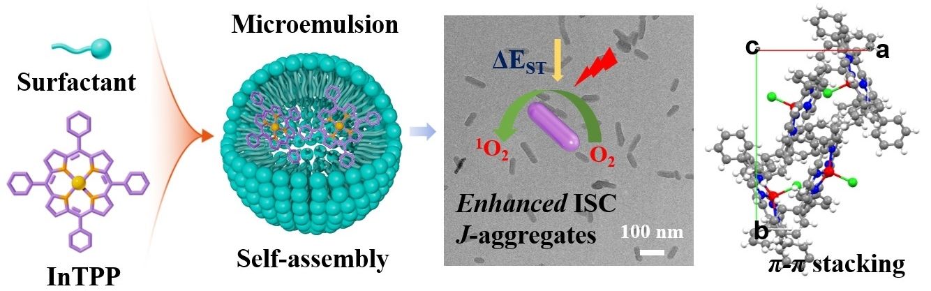 目前,研究者开发了一系列结构明确的超分子纳米光敏剂,有利推动了光敏剂的发展。然而纳米结构内部分子排列方式与光动力性能之间关系的研究则很少涉及,这对于开发高效稳定的纳米光敏剂,进而提升光动力治疗效果非常重要。针对以上问题,我们以四苯基铟卟啉(InTPP)为单体,利用微乳辅助/介相转移自组装的方式可控制备一系列铟卟啉基纳米材料,研究铟卟啉与乳化剂之间的作用方式,探究纳米材料内部结构与单线态氧生成性能的关系。研究表明,在阳离子乳化剂CTAB条件下,组装体内部卟啉分子为有序堆积方式;在阴离子乳化剂SDS条件下,SDS的阴离子端倾向于取代中心金属配位的Cl,形成无序堆积的球形组装体;两亲性乳化剂DSPE-PEG-COOH和DSPE-PEG-COONa则分别形成纳米片和纳米颗粒。在635 nm激光照射下,纳米棒生成单线态氧性能最好,其次是纳米颗粒,然后是纳米球,纳米片光动力性能最差。单晶结构解析和理论计算表明,纳米棒中铟卟啉分子沿b-c面J型堆积,相较于InTPP单分子隙间窜越加快,表现出优异的单线态氧产生能力。细胞和动物实验表明,材料具有良好的生物相容性和细胞光毒性,经过单次治疗,InTPP纳米棒能有效消除肿瘤,表现出优异的抗肿瘤性能。