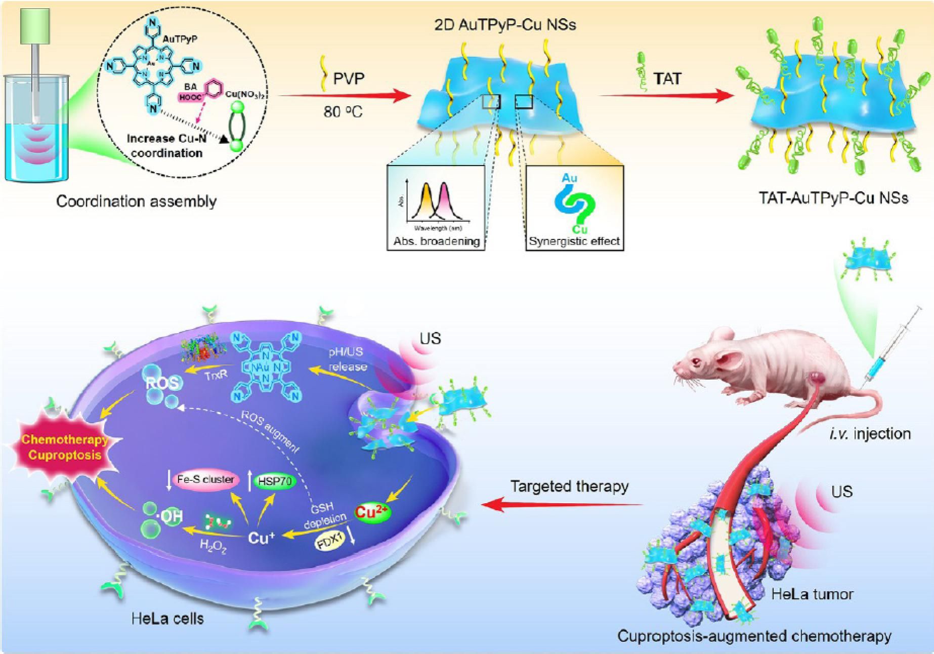 复杂的肿瘤微环境(TME)导致癌细胞易于转移、无限制增殖和耐药性,这导致目前的癌症治疗方法(包括手术、放疗和化疗)仍然面临不良的预后。铜死亡作为一种新发现的铜依赖性细胞死亡模式,不同于常见的细胞死亡模式,凋亡、坏死性凋亡和自噬。然而,广泛使用的铜螯合剂和铜补充剂,长期口服给药导致铜在肝脏中的积累和持续对肝细胞损伤。因此开发有效的铜死亡激活剂仍然是一个有前景但极具挑战性的研究领域。超声波(US)是一种非侵入性的机械波,具有高的组织穿透深度。US触发铜死亡活化剂可控释放表现出优良的治疗效果和广泛的生物医学应用前景。我们以Au(III)四-(4-吡啶基)卟啉(AuTPyP)为配体,铜离子(Cu2+)为节点,通过配位自组装策略,构筑了二维金属有机骨架(MOF)纳米超薄片(2DAuTPyP-Cu NSs)。通过精确调控Cu(NO3)2,苯甲酸、PVP三者的投料量,实现了二维纳米片厚度的可控。最优条件获得的超薄片厚度为3.0 nm,约5~6个分子层,具有大量的表面原子,可以为肿瘤微环境(TME)中的催化反应提供丰富的活性位点。该2D AuTPyP-Cu NSs经靶向修饰后进入肿瘤细胞,AuTPyP中吡啶基在酸性TME中质子化和深穿透超声(US)双刺激共同触发可控释放出AuTPyP和Cu2+。一方面,铁氧还蛋白1(FDX1)可将Cu2+还原为毒性更强的Cu+,并抑制Fe-S簇蛋白的生物合成。Cu2+增加二氢硫辛酰胺乙酰转移酶(DLAT)的异常聚集,并上调应激诱导的热休克蛋白(HSP70)的水平以产生蛋白质毒性应激并最终导致细胞死亡,导致明显的线粒体空泡和损伤,但不损害正常细胞;另一方面,Cu2+消耗肿瘤中过表达的谷胱甘肽(GSH),被还原为Cu+,接着发生类Fenton反应催化肿瘤中过表达的过氧化氢(H2O2)转化为活性氧。同时,释放的AuTPyP可与硫氧还蛋白还原酶特异性结合,激活肿瘤细胞的氧化还原失衡,起到化疗作用。GSH的消耗和线粒体功能损伤共同导致细胞对氧化应激和化疗药物刺激的敏感性增加,显著促进了细胞死亡。这种US/pH双刺激响应的铜死亡增强化疗显著提高了肿瘤治疗效果,为有效的肿瘤治疗提供了新的策略。