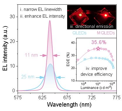 量子点发光二极管(QLED)在色彩纯度和发光效率方面表现出色,已成为未来高清显示技术的候选产品。然而,大多数QLED器件通常表现出超过20 nm的发射线宽,且如何实现超窄发射又可同时显著提升器件效率仍然是一个巨大的挑战。本文通过射频磁控溅射方法,成功地将分布式布拉格反射器引入到常规电致发光器件中开发出了一种实现超窄发射的平面微腔结构。利用这种微腔结构产生的强光学共振效应,成功获得了兼具高外量子效率(35.6%)和超窄发射线宽(11 nm)的红色QLED,其色坐标超出了BT.2020红色坐标范围。这种平面微腔结构的引入为超窄发射、高效率QLED的发展提供了有效参考和技术手段。