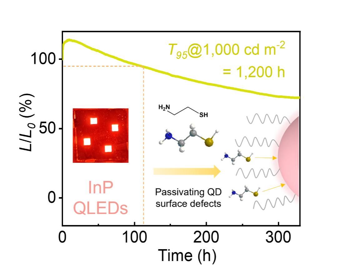 InP基量子点(QDs)无毒且具有可与Cd/Pb基ODs相媲美的光学性质,被认为是新一代绿色环保的发光材料。然而,InP QDs表面存在大量的非辐射位点,器件中电子-空穴注入不平衡等问题严重影响了QLEDs的效率和稳定性。